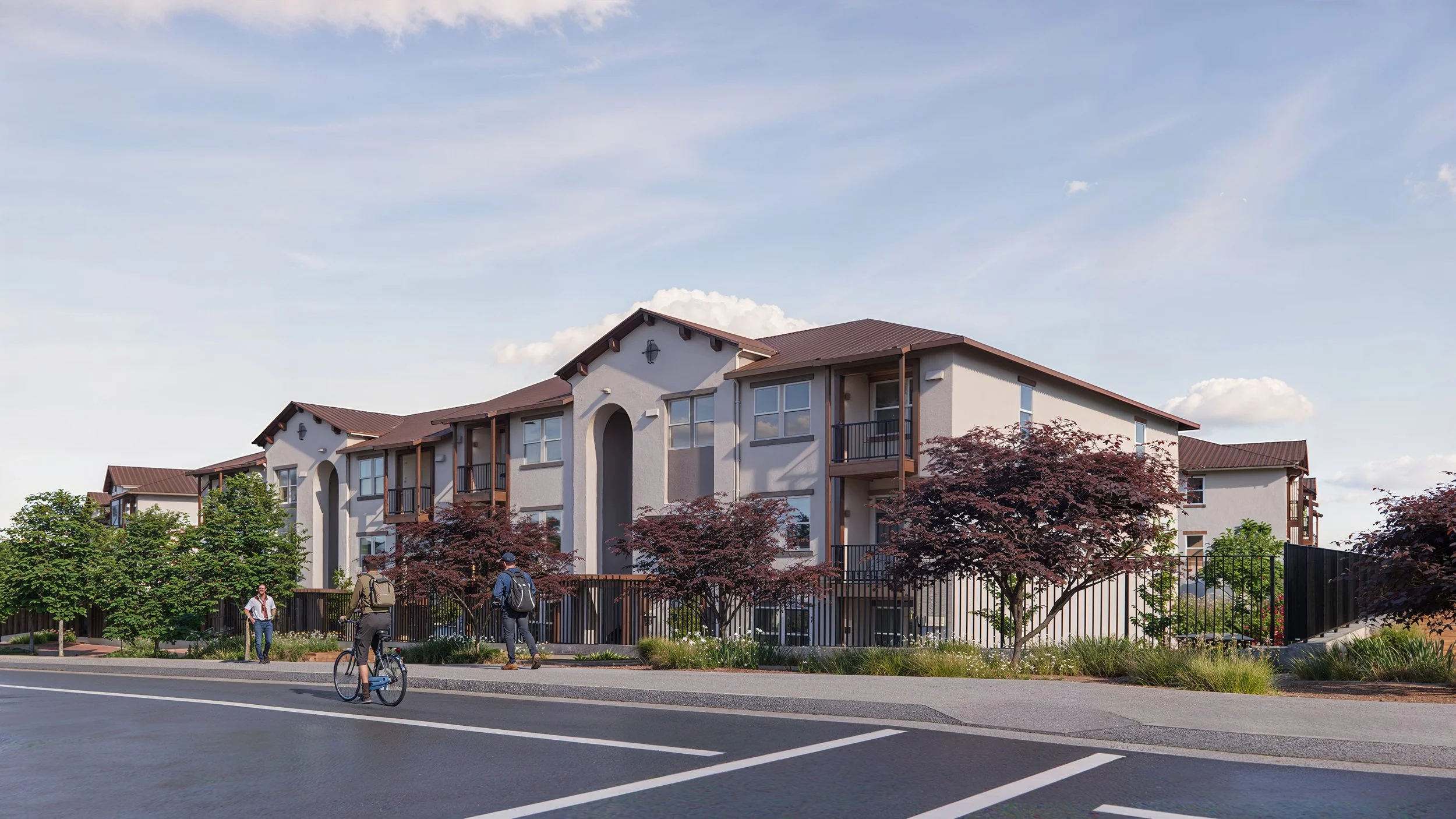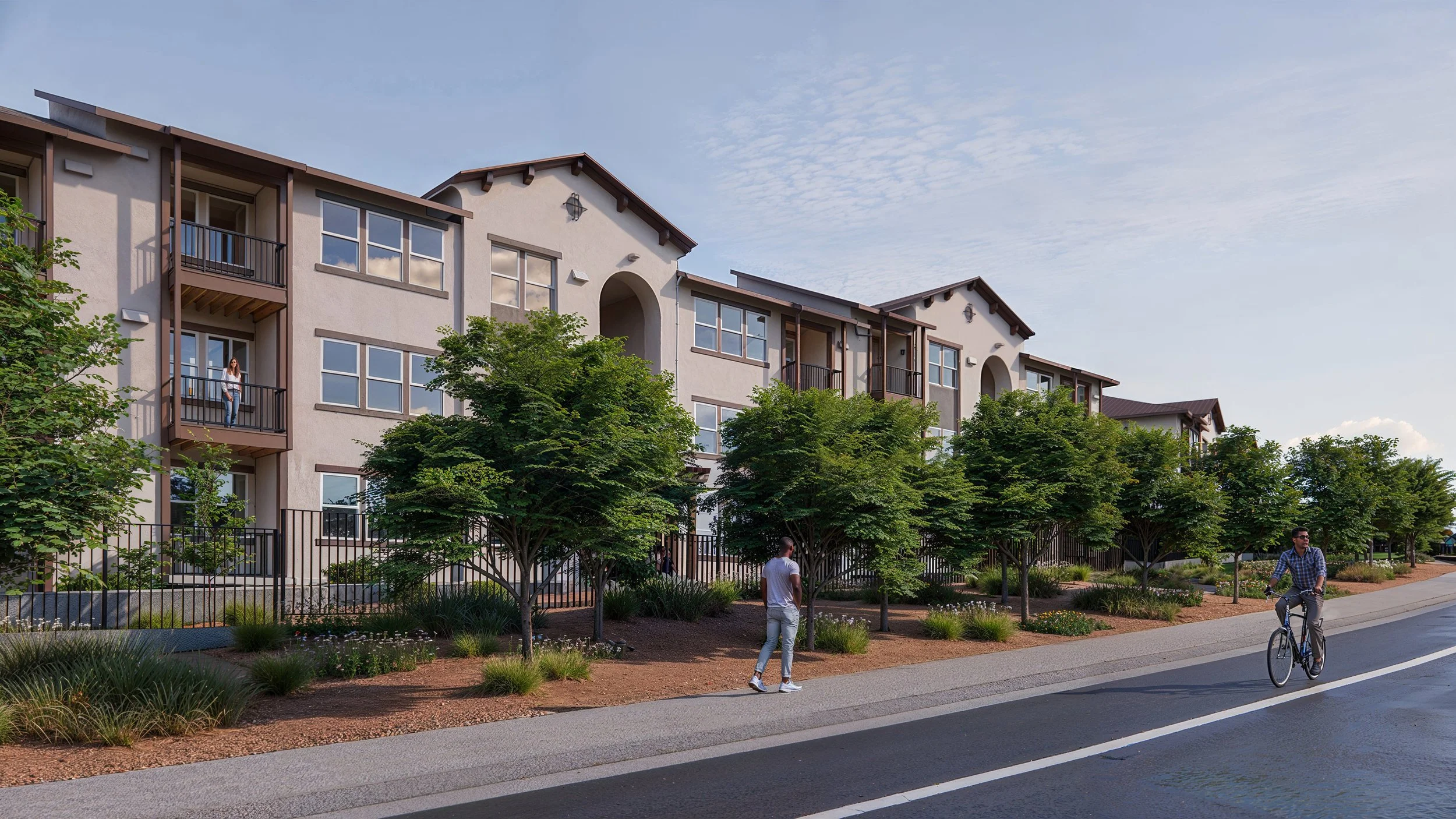 Incorporates generous landscape buffers, setbacks, and stepped building heights to ensure compatibility with adjacent neighborhoods and to create a welcoming streetscape.